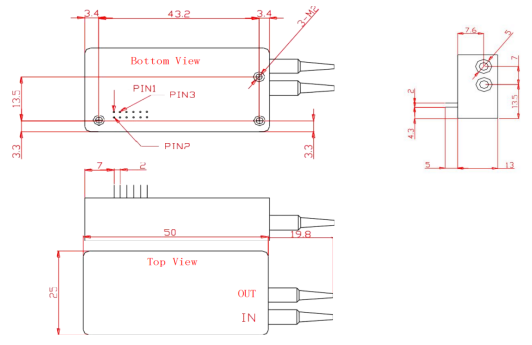 1.DESCRIPTIONZg introduces a new miniature variable attenuator for application in either the C or L band. The attenuator offers excellent wavelength dependence and ripple, low polarization dependent loss (PDL), and improved thermal stability. The attenuator provides an economical solution to managing optical power. Reflective optics permit same-side jumper exit and enable easy panel mounting. The attenuator uses an advanced graded neutral density filter as its attenuating element. Adjustment is through a stepper motor with feedback control terminal. The driver for the stepper motor moves the motor up or down in uniform step sizes, offering fine resolution. Latching operation is a standard feature; upon removal of the drive voltage, the most recent attenuation setting is retained. An optional resistance readout for filter location purposes is available. The schematic figure of the attenuator is shown in figure 1.