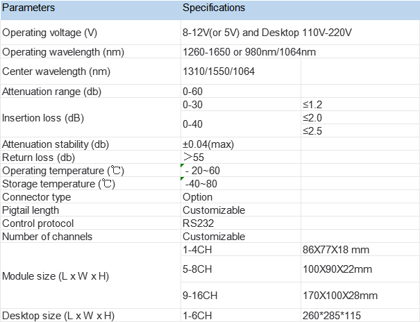 Operating wavelength 1260-1650 or 980nm/1064nm, Attenuation range: 0-60dB
