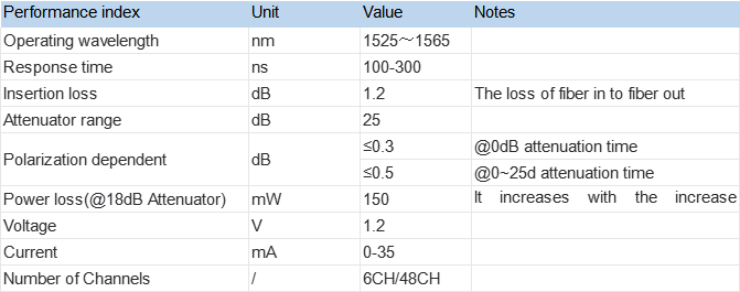 It has the ability to support Dark light, lower power consumption and faster switching speed. Silicon-based VOA array device is an all-solid-state chip, with a response speed of hundred nanosecond level, eight-channel monolithic integration, low power consumption, to meet the requirements of optical transmission, optical sensing system for optical attenuator high-speed response, miniaturization, high reliability. Its response speed is 4 orders of magnitude higher than that of traditional VOA, reaching 100ns level, making it possible to quickly control optical power in WDM optical network. In addition, its ultra-low optical loss can meet the requirements of civil optical network applications, its extremely high integration helps to greatly reduce the module size, and its pure solid-state waveguide chip makes it have excellent reliability.